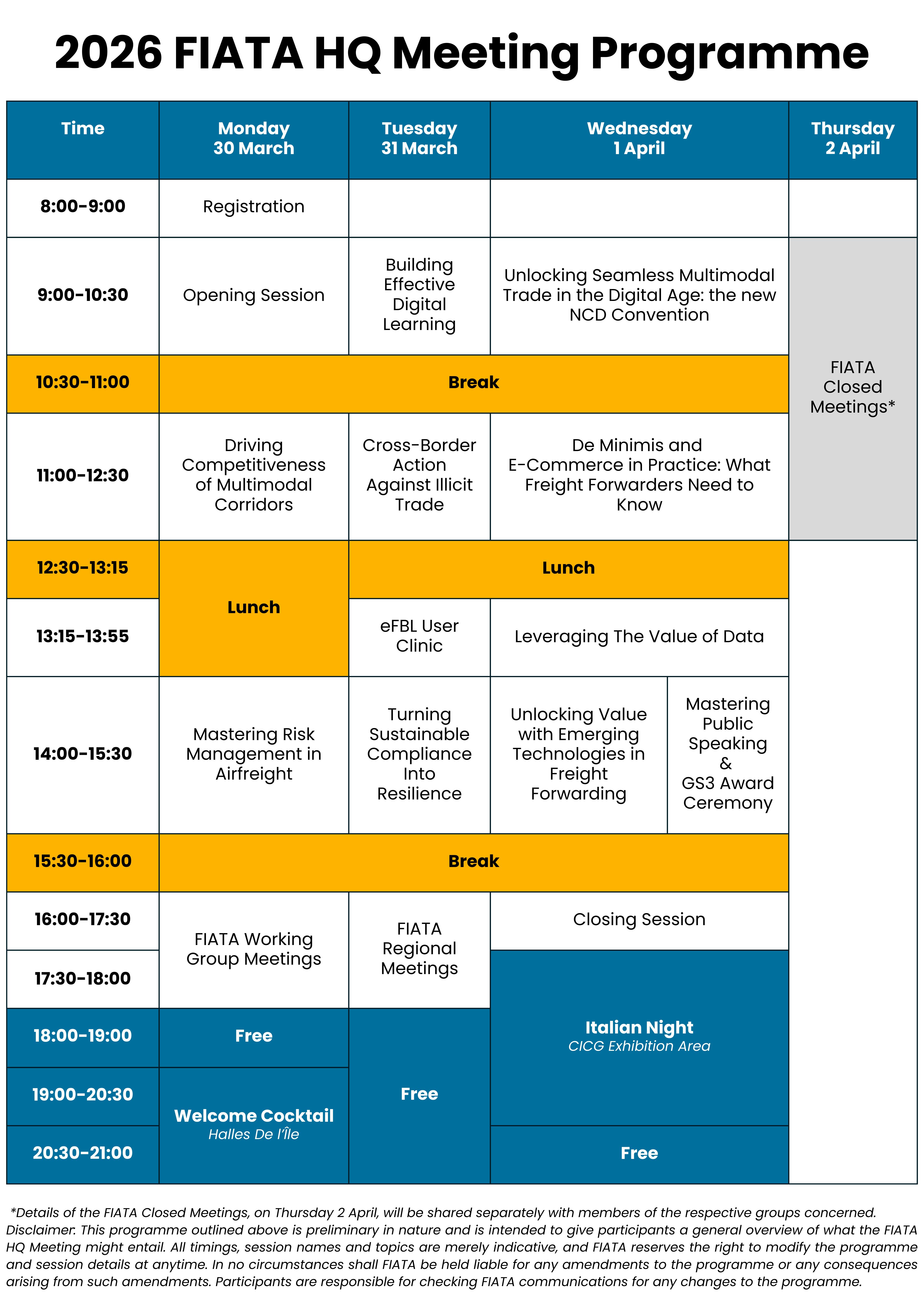 The registration for the 2026 FIATA HQ Meeting is free for FIATA Members. The food and beverage contributions for FIATA Members is CHF 320.