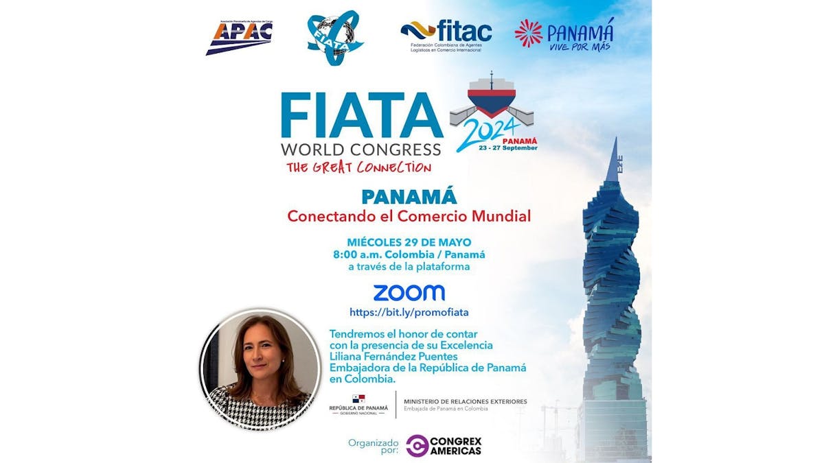 Do not miss the webinar 'Panama Conectando el Comercio Mundial' on 29 May 2024 at 8:00 Colombia / Panama time on Zoom. Her excellency Liliana Fernandez Puentes, embassador from the Republic of Panama in Colombia, will provide insights on Panama connecting role in international trade featuring the 2024 FIATA World Congress (FWC) to be held in Panama from 23 to 27 September 2024.