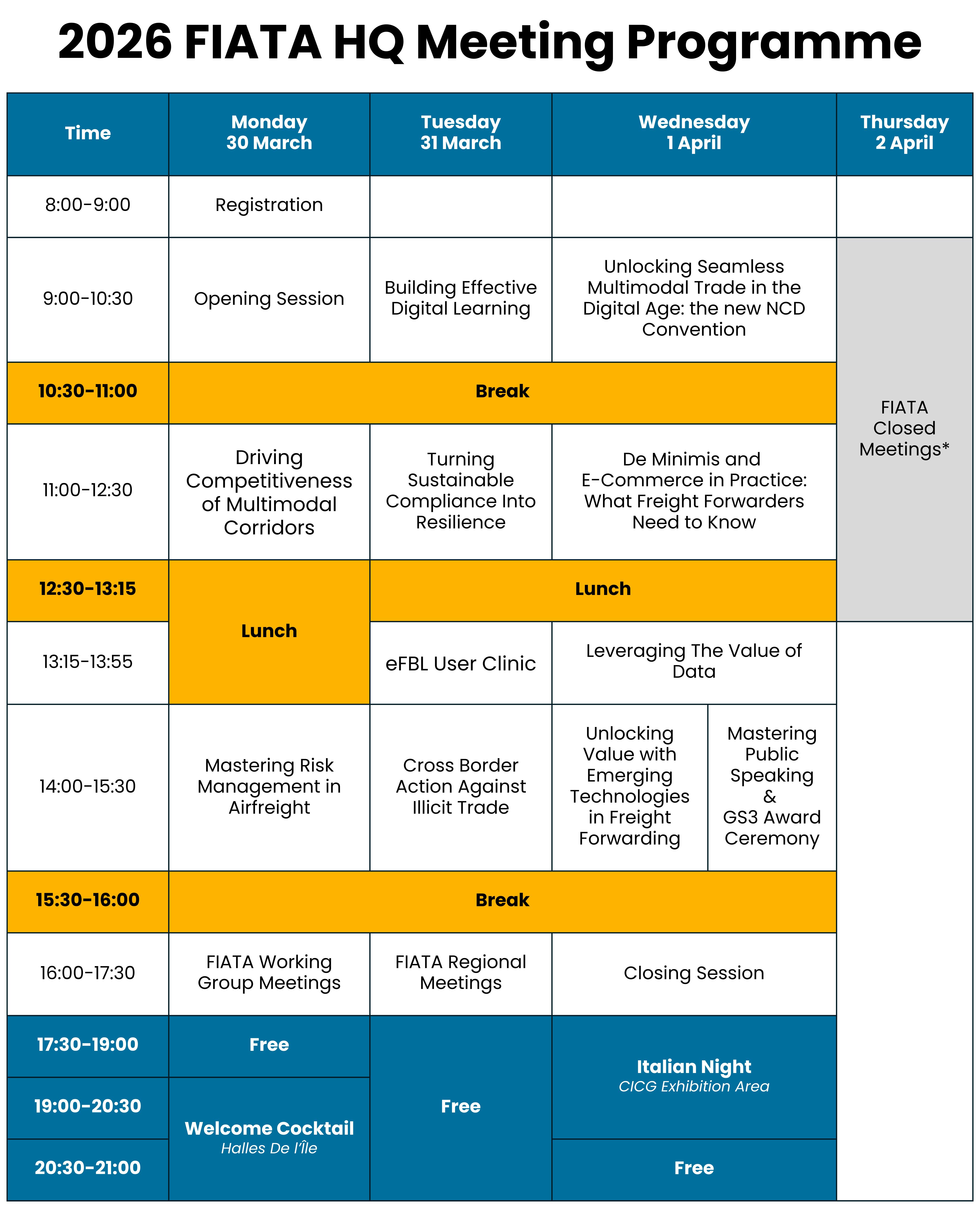 *Details of the FIATA Closed Meetings, on Thursday 2 April, will be shared separately with members of the respective groups concerned.